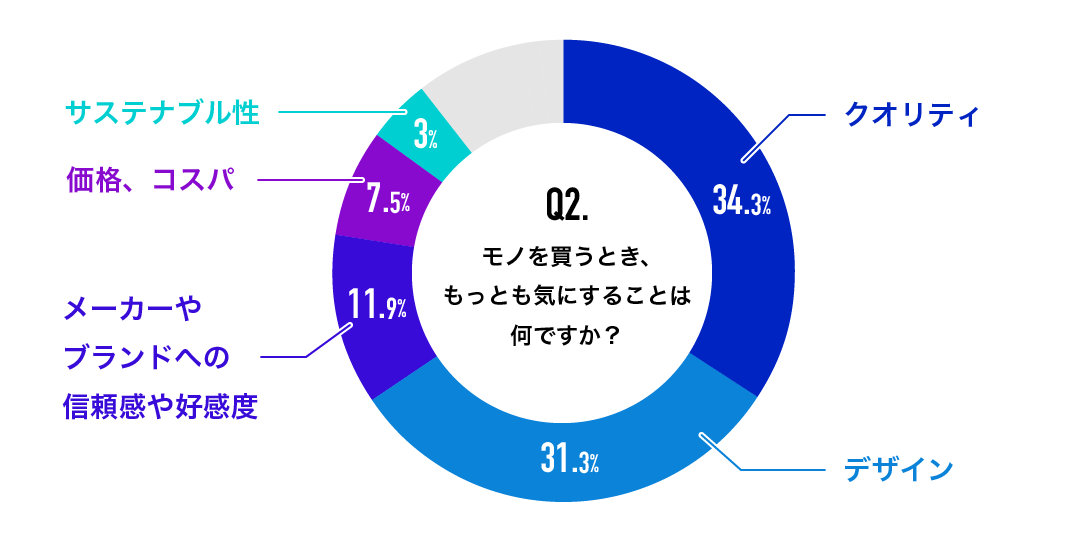 毎日、毎日、新商品やそれに付随する情報と接しているからこそ、クオリティを大切にしてモノを買う。次いで、気にするのはデザイン。やっぱりカッコイイとかカワイイモノって、それだけで気分が上がる。モノを選ぶときに、価格をもっとも気にすると回答した人は全体の7.5%と少なかった。安いのはもちろんうれしいけど、やっぱりそのモノのもつ魅力とかストーリーに共感して、モノを買うという行動をするのかもしれない。