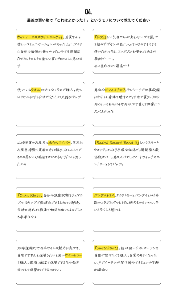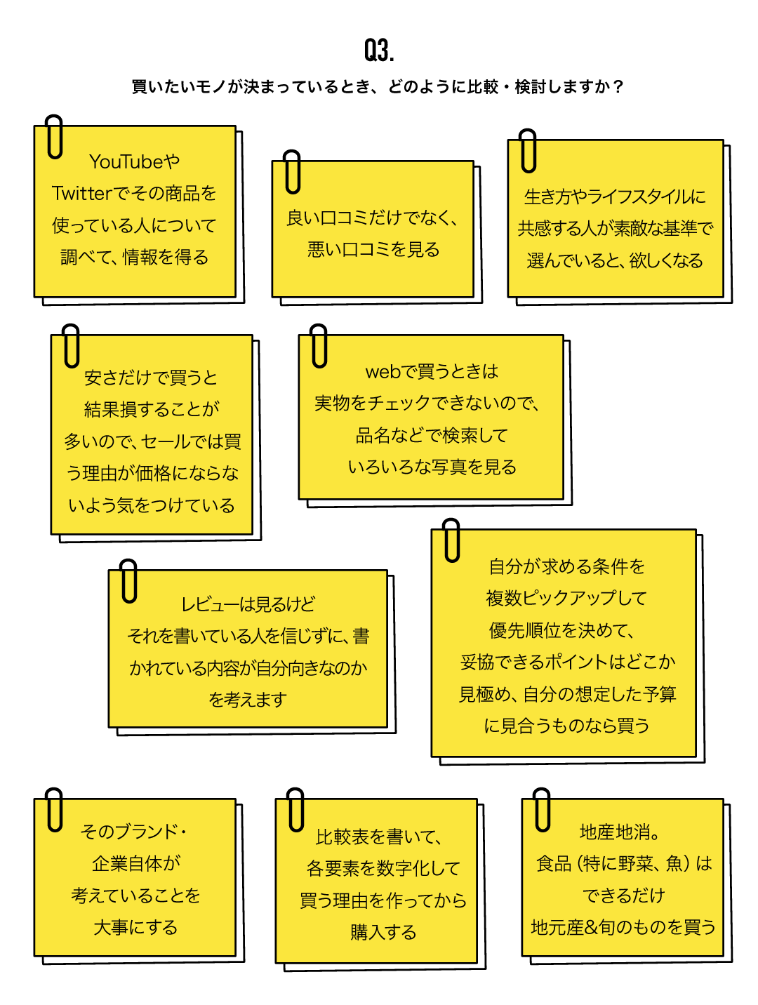 「これ、自分もやってる」という意見はあっただろうか?欲しいモノのスペックや価格の比較はもちろんのこと、そのモノに込められたストーリーや、買う理由と意味を探すような意見が見られた。